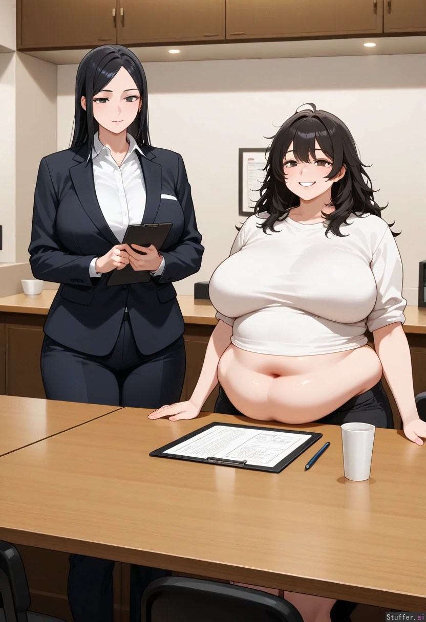Bbw, middle heavy, long messy black hair, caring smile, wearing a black suit with a white shirt, holding a clipboard and pencil, standing behind restaurant counter, next to fat female restaurant coworkers, fat belly pressing against desk, 1 person