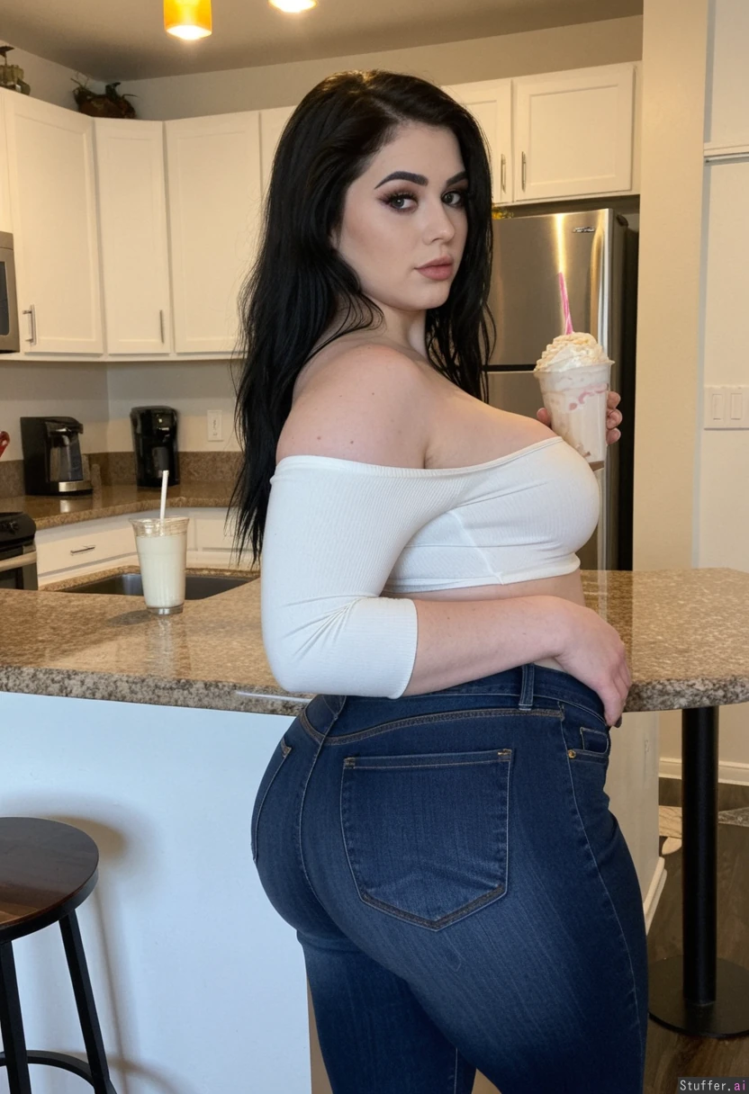 Stood in kitchen with table, highly realistic, solo female, (emo),beautiful white american, female, instragram model, perfect face, slim face, dark eyes, defined jawline, messy long black hair, hourglass shaped body, narrow shoulders, wide ass, looking at viewer, (full frontal view), (facing viewer), (looking at viewer), (curvy:1.0), heavy dark eye makeup (chubby:1.0), (inflated belly:1.0), (White off shoulder top), (low rise jeans) Stood next to table, female drinking a milkshake,