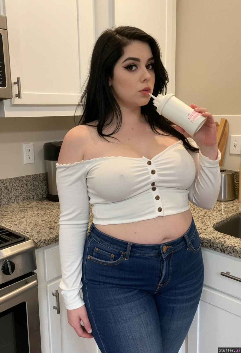 Stood in kitchen, highly realistic, (emo),beautiful white american, female, instragram model, perfect face, slim face, dark eyes, defined jawline, messy long black hair, hourglass shaped body, narrow shoulders, wide waist, looking at viewer, (facing viewer), (looking at viewer), (curvy:1.0), heavy dark eye makeup (chubby:1.0), (bloated belly:1.0), (White off shoulder top), (low rise unbuttoned jeans) female drinking a milkshake,