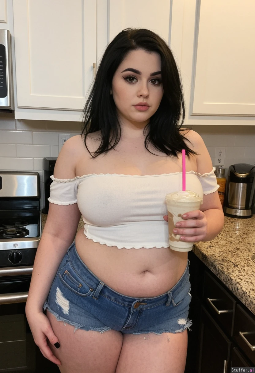 Stood in kitchen, highly realistic, (emo),beautiful white american, female, instragram model, perfect face, slim face, dark eyes, defined jawline, messy long black hair, hourglass shaped body, narrow shoulders, wide waist, large breasts, looking at viewer, (facing viewer), (looking at viewer), (curvy:1.0), heavy dark eye makeup (chubby:1.0), (bloated belly:1.0), (White off shoulder top), (low rise shorts) female drinking a milkshake