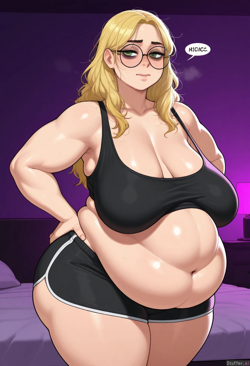 krekkov(artist), KAMII MOMORU(artist), amazing resolution ((messy blonde hair, green eyes, tall, dark bags under eyes, wide hips, chubby arms, double chin)) white boxer shorts, glasses, big butt, thicc thighs, bedroom, purple lighting, flustered, hairy facing viewer (((big belly, sagging breasts)))