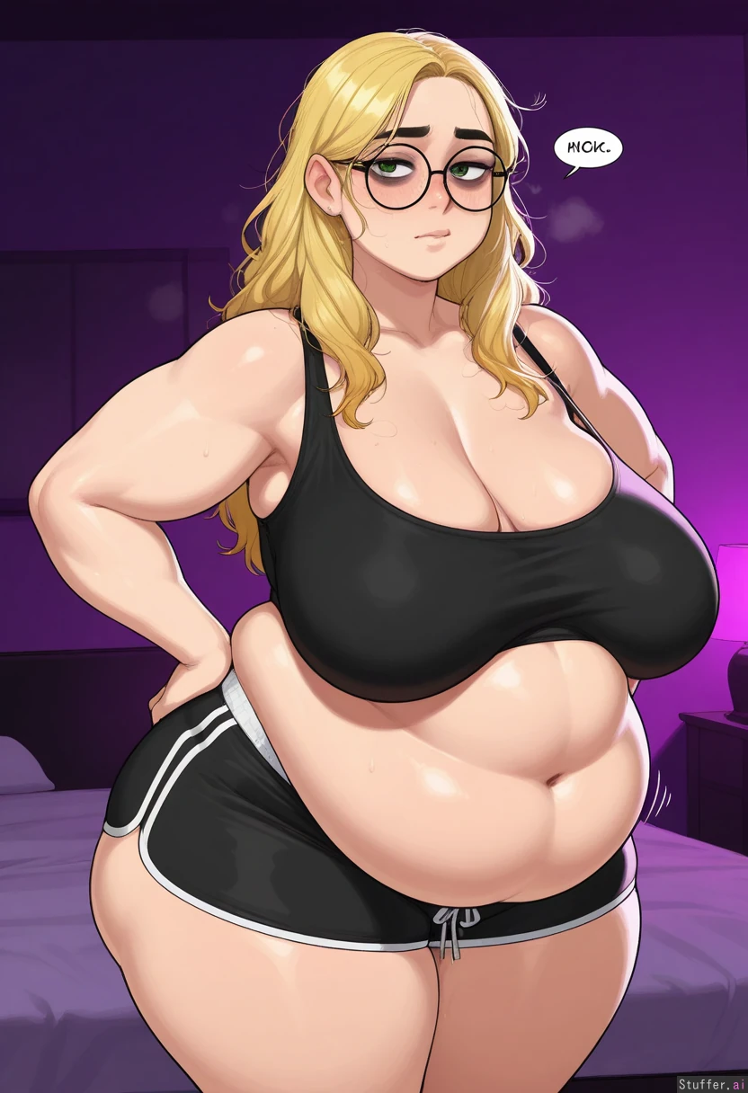 krekkov(artist), KAMII MOMORU(artist), amazing resolution ((messy blonde hair, green eyes, tall, dark bags under eyes, wide hips, chubby arms, double chin)) white boxer shorts, glasses, big butt, thicc thighs, bedroom, purple lighting, flustered, hairy facing viewer ((big belly, sagging breasts))