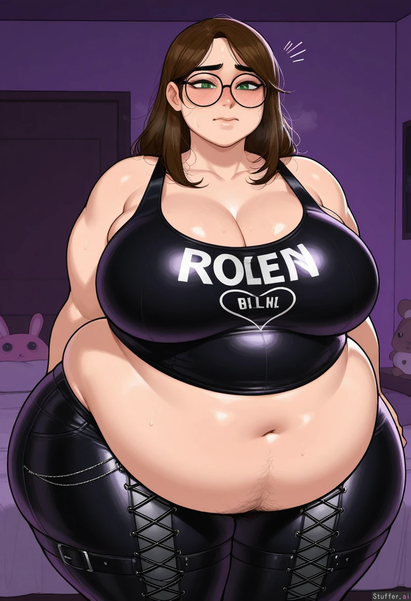 (krekkov(artist), KAMII MOMORU(artist), amazing resolution) ((messy brown hair, green eyes, tall, wide hips, chubby arms, double chin)) (leather fetish lingeie), glasses, big butt, thicc thighs, bedroom, purple lighting, embarrassed, hairy facing viewer ((big belly, stuffed belly, obese))