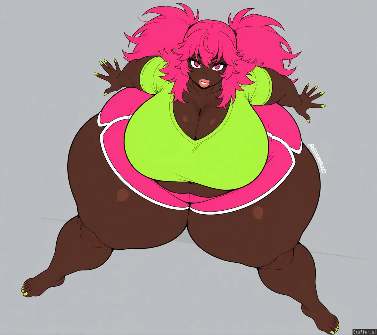 no fart, very dark_skin, hot pink hair, lime_green_shirt, pink shorts, long fingernails, long toenails, (lime green nails), (pale soles), pink eyes, long hair, spiky_hair, sharp_toenails, alone, 1girl, cel_shading, flat_color, (hyper bottomheavy), (gigantic hips), (gigantic_thighs), from_above, (plump_lips)