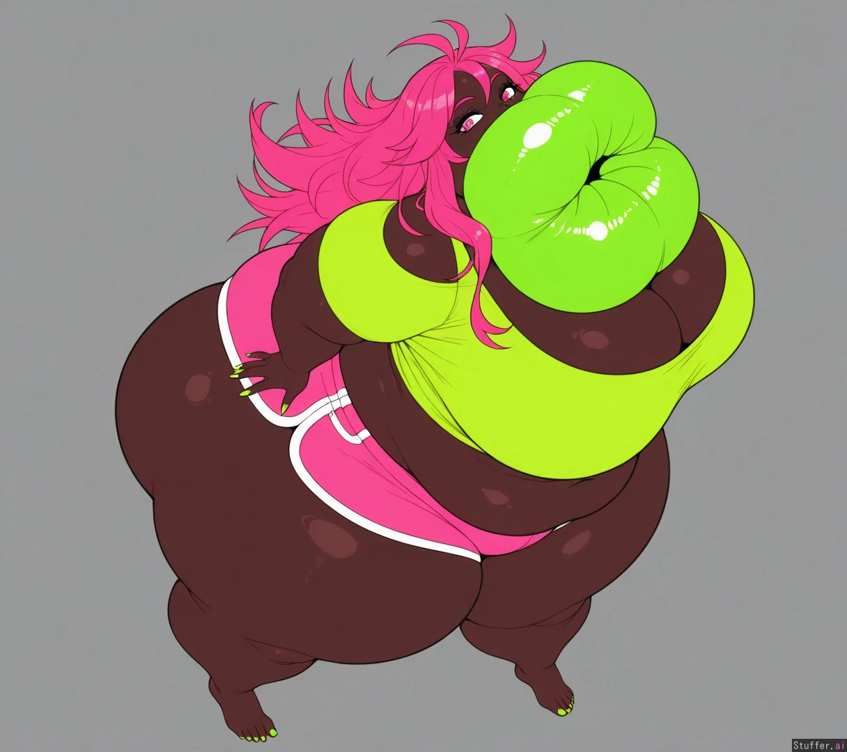 no fart, very dark_skin, hot pink hair, lime_green_shirt, pink shorts, long fingernails, long toenails, (lime green nails), (pale soles), pink eyes, long hair, spiky_hair, sharp_toenails, alone, 1girl, cel_shading, flat_color, (hyper bottomheavy), (gigantic hips), (gigantic_thighs), from_above, (plump_lips: 1.4) lime green lips, (hyper gigantic lips: 1.6)