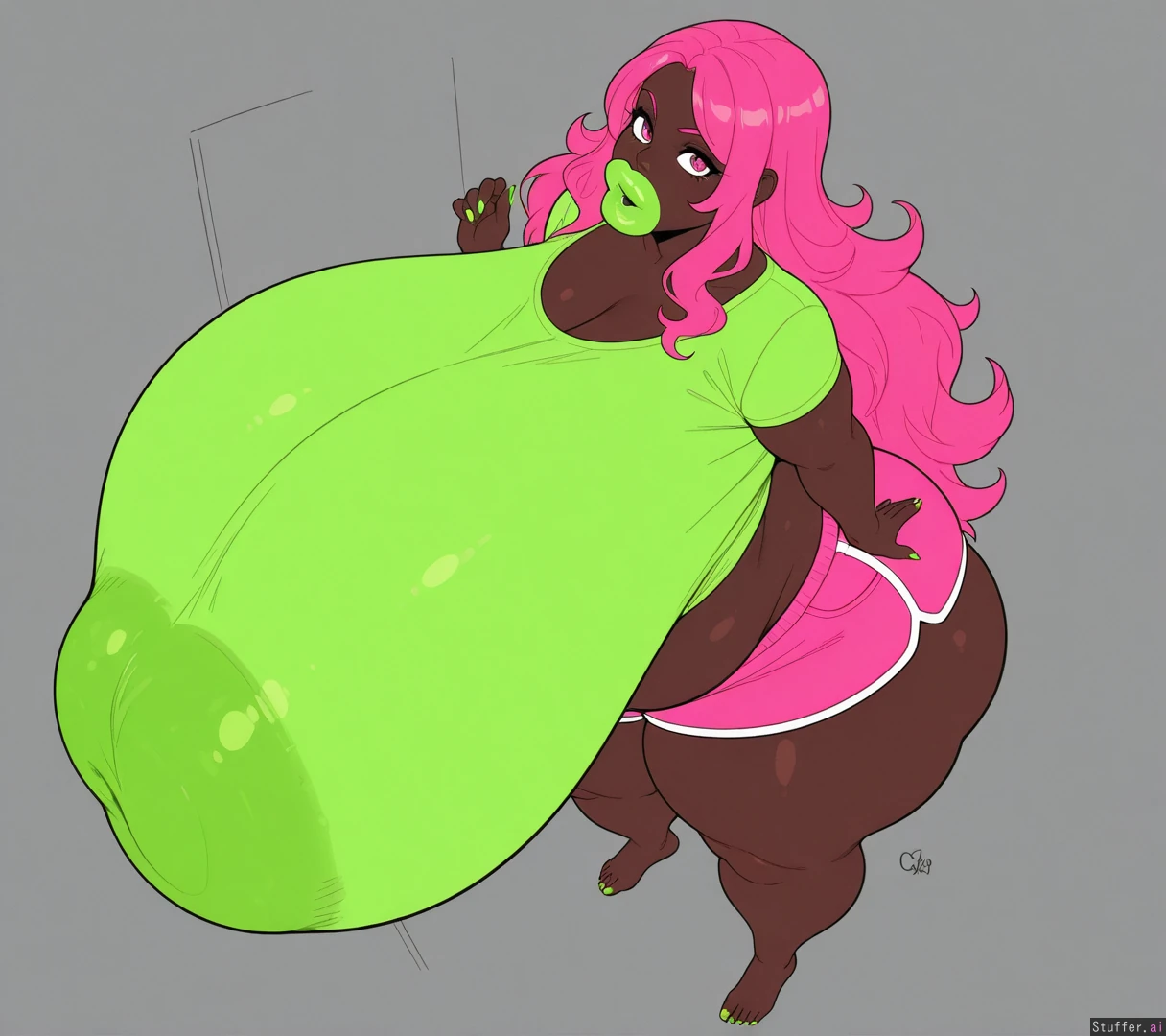 no fart, very dark_skin, hot pink hair, lime_green_shirt, pink shorts, long fingernails, long toenails, (lime green nails), (pale soles), pink eyes, long hair, spiky_hair, sharp_toenails, alone, 1girl, cel_shading, flat_color, (hyper bottomheavy), (gigantic hips), (gigantic_thighs), from_above, (plump_lips: 1.4) lime green lips, (hyper gigantic lips: 1.6)
