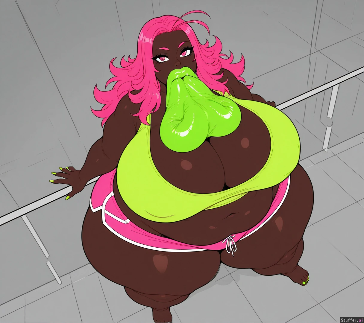 no fart, very dark_skin, hot pink hair, lime_green_shirt, pink shorts, long fingernails, long toenails, (lime green nails), (pale soles), pink eyes, long hair, spiky_hair, sharp_toenails, alone, 1girl, cel_shading, flat_color, (hyper bottomheavy), (gigantic hips), (gigantic_thighs), from_above, (plump_lips: 1.4) lime green lips, (hyper gigantic lips: 1.6)