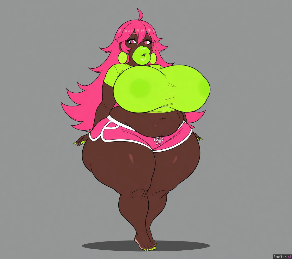 no fart, very dark_skin, hot pink hair, lime_green_shirt, pink shorts, long fingernails, long toenails, (lime green nails), (pale soles), pink eyes, long hair, spiky_hair, sharp_toenails, alone, 1girl, cel_shading, flat_color, (hyper bottomheavy), (gigantic hips), (gigantic_thighs), (plump_lips: 1.4) lime green lips, (hyper gigantic lips: 1.5),