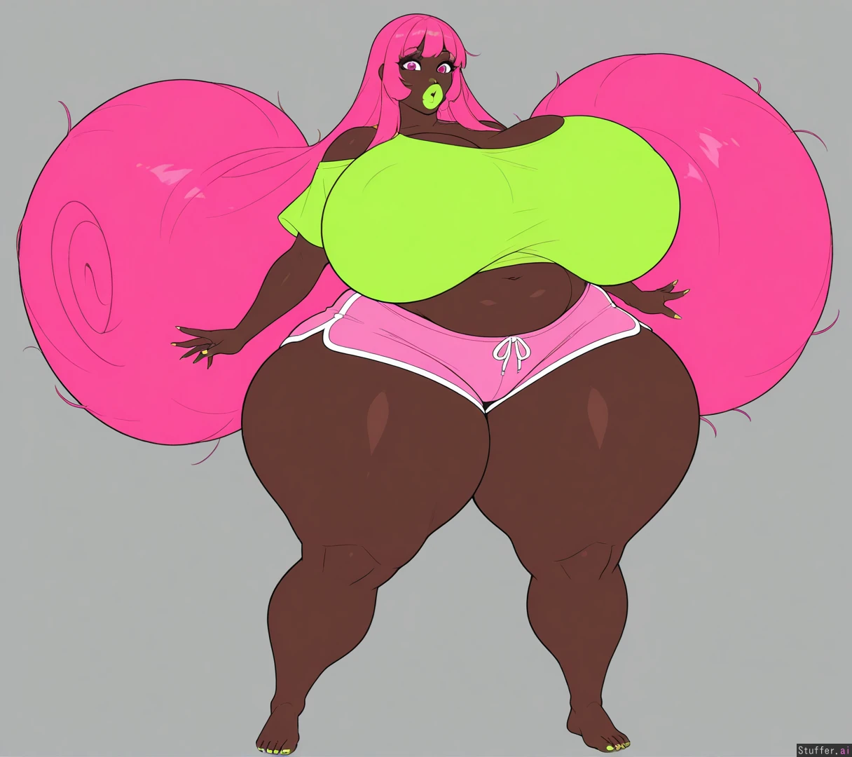 no fart, very dark_skin, hot pink hair, lime_green_shirt, pink shorts, long fingernails, long toenails, (lime green nails), (pale soles), pink eyes, long hair, spiky_hair, sharp_toenails, alone, 1girl, cel_shading, flat_color, (hyper bottomheavy), (gigantic hips), (gigantic_thighs), (plump_lips: 1.4) lime green lips, (hyper gigantic lips: 1.4), face_first