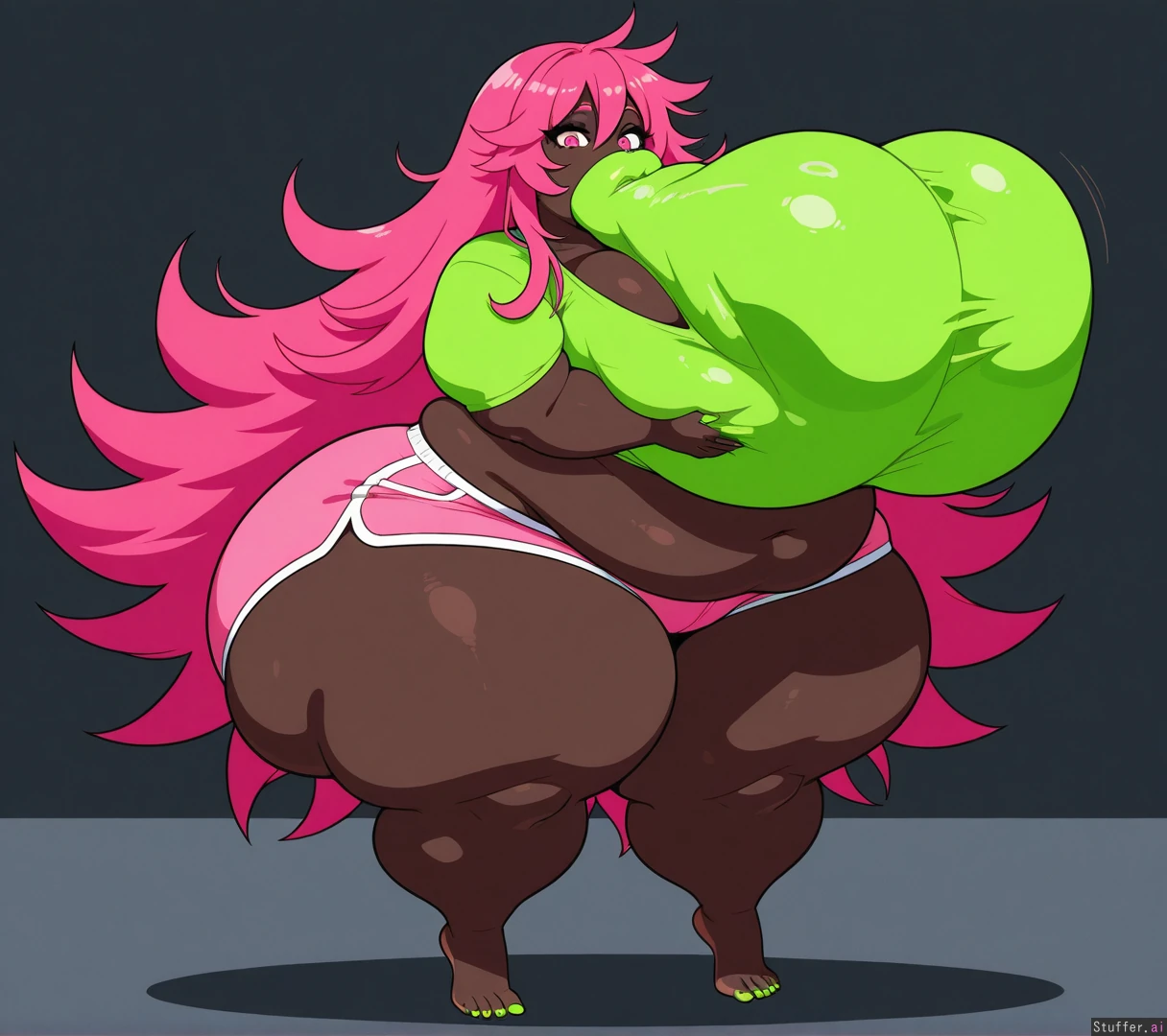 no fart, very dark_skin, hot pink hair, lime_green_shirt, pink shorts, long fingernails, long toenails, (lime green nails), (pale soles), pink eyes, long hair, spiky_hair, sharp_toenails, alone, 1girl, cel_shading, flat_color, (hyper bottomheavy), (gigantic hips), (gigantic_thighs), (plump_lips: 1.4) lime green lips, (hyper gigantic lips: 1.5), shopping