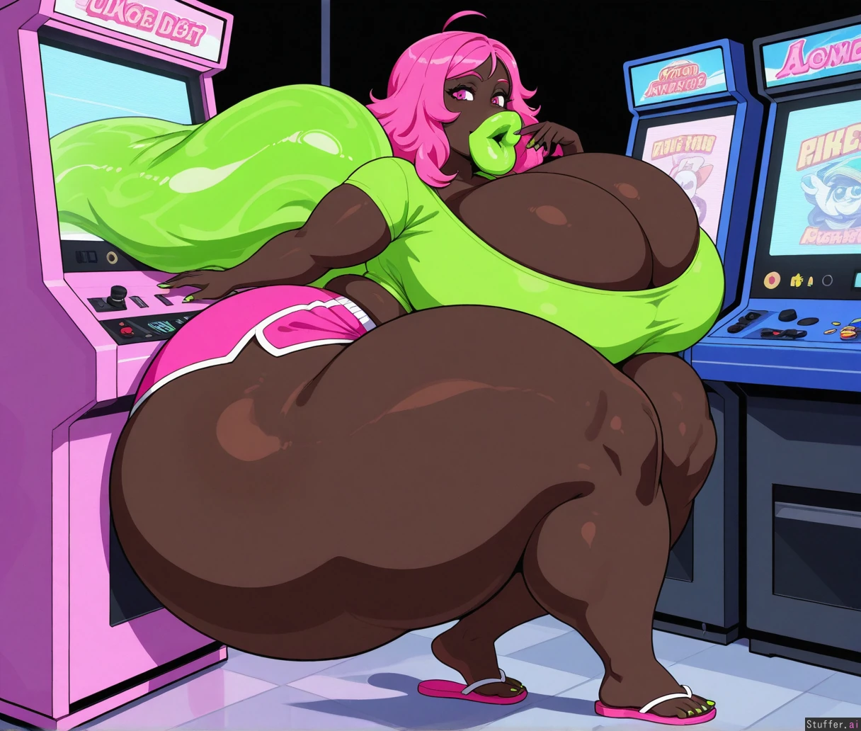 no fart, very dark_skin, hot pink hair, lime_green_shirt, pink shorts, long fingernails, long toenails, (lime green nails), (pale soles), pink eyes, long hair, spiky_hair, sharp_toenails, alone, 1girl, cel_shading, flat_color, (hyper bottomheavy), (gigantic hips), (gigantic_thighs), (plump_lips: 1.4) lime green lips, (hyper gigantic lips: 1.5), arcade, flip-flops