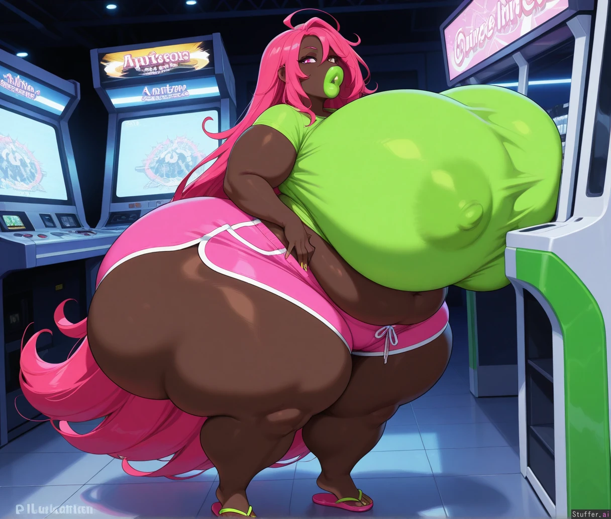 no fart, very dark_skin, hot pink hair, lime_green_shirt, pink shorts, long fingernails, long toenails, (lime green nails), (pale soles), pink eyes, long hair, spiky_hair, sharp_toenails, alone, 1girl, cel_shading, (hyper bottomheavy), (gigantic hips), (gigantic_thighs), (plump_lips: 1.4) lime green lips, (gigantic lips: 1.5), arcade, flip-flops