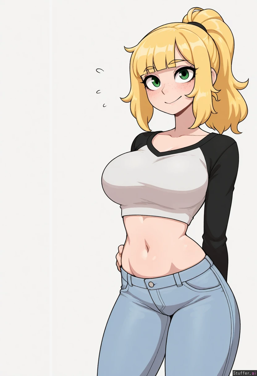 best quality, ultra detailed, high quality, high resolution, Solo, merunyaa, usa37107692, nyantcha, limebreaker, ohasi_art, krekkov, betterwithsalt, correct anatomy, beautiful face, detailed face, detailed eyes, beautiful eyes, ((sexy)), ((Solo)), (front view), (Standing up), (Casual expression), standing, Blushing, aroused, (front view), looking at viewer, intricately detailed sexy expressive eyes, green eyes, (long blonde hair, long blonde hair, ponytail, bangs), sexy face, thin face, (((freckles))), 27 years old, mature, (flat belly), thin waist, white white_background, (gigantic ass, gigantic thighs, extremely gigantic hyper breasts:0.7)