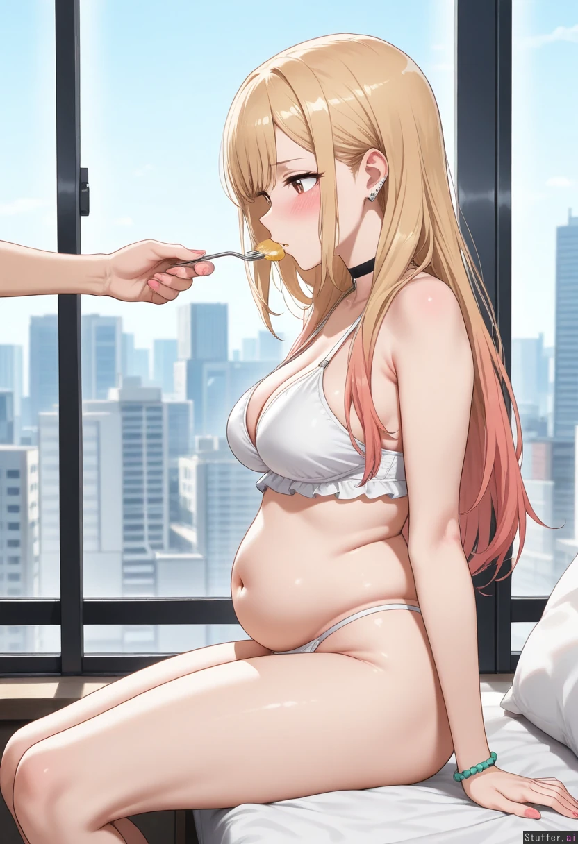 High quality, masterpiece, extraordinary detailed, perfect anatomy, (1girl, blushed, disbelief, shy, blushing, dreamy brown eyes rolling), (Full white thong), ((Marin Kitagawa)), (Full round belly:1.3), (Love handeles), (Saggy), (Morbidly obese:0.1), (Super fit body:0.2) (Side view), (Sitting in Appartement), (Window, futuristic city, bright room), (Leaning), (Female pov gentle force feeding her delicious piece of cake with a fork:1.0)