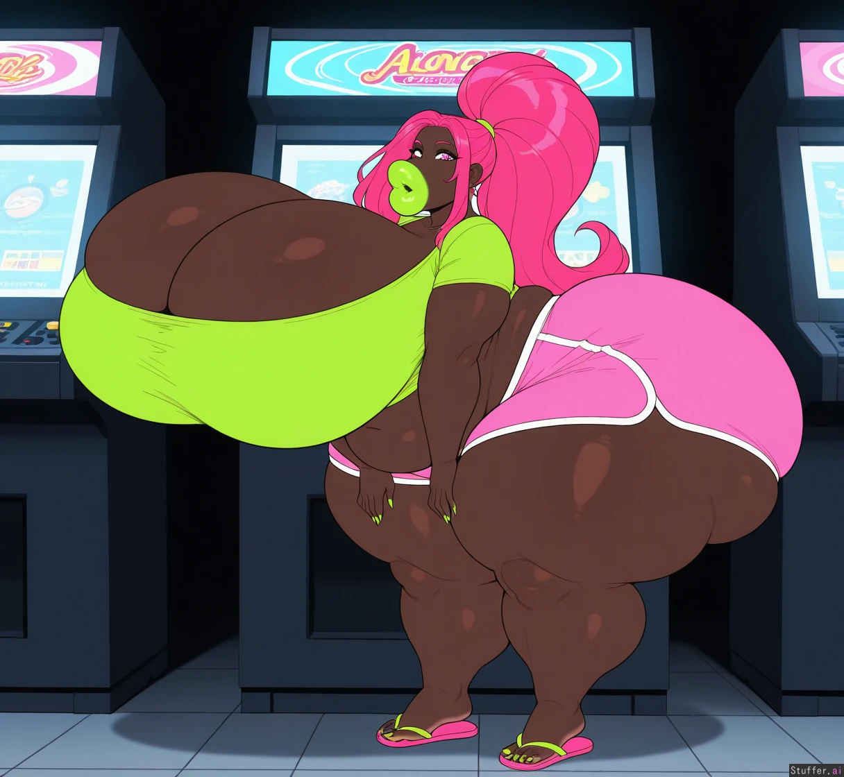 no fart, very dark_skin, hot pink hair, lime_green_shirt, pink shorts, long fingernails, long toenails, (lime green nails), (pale soles), pink eyes, long hair, spiky_hair, sharp_toenails, alone, 1girl, cel_shading, (hyper bottomheavy), (gigantic hips), (gigantic_thighs), (plump_lips: 1.4) lime green lips, (gigantic lips: 1.5), arcade, flip-flops, flat_color, ponytail