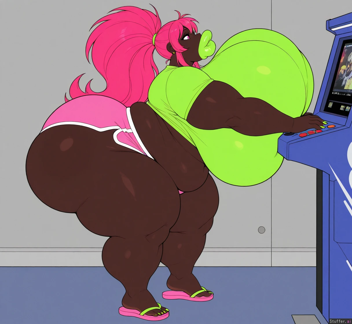 no fart, very dark_skin, hot pink hair, lime_green_shirt, pink shorts, long fingernails, long toenails, (lime green nails), (pale soles), pink eyes, long hair, spiky_hair, sharp_toenails, alone, 1girl, cel_shading, (hyper bottomheavy), (gigantic hips), (gigantic_thighs), (plump_lips: 1.4) lime green lips, (gigantic lips: 1.5), arcade, flip-flops, flat_color, ponytail