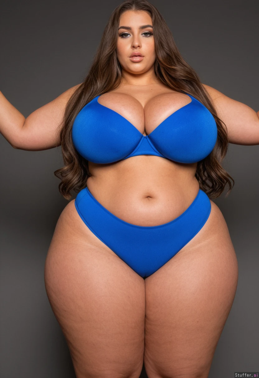 Very realistic, highly detailed 25 year old woman Tan skin Blue eyes Long brown wavy hair Blue athletic shorts and (blue push-up bra) Cleavage showing (((((((Wide massive over-sized enormous hips))))))) ((Curvy extra wide long hips)) ((Large rotund cleavage))