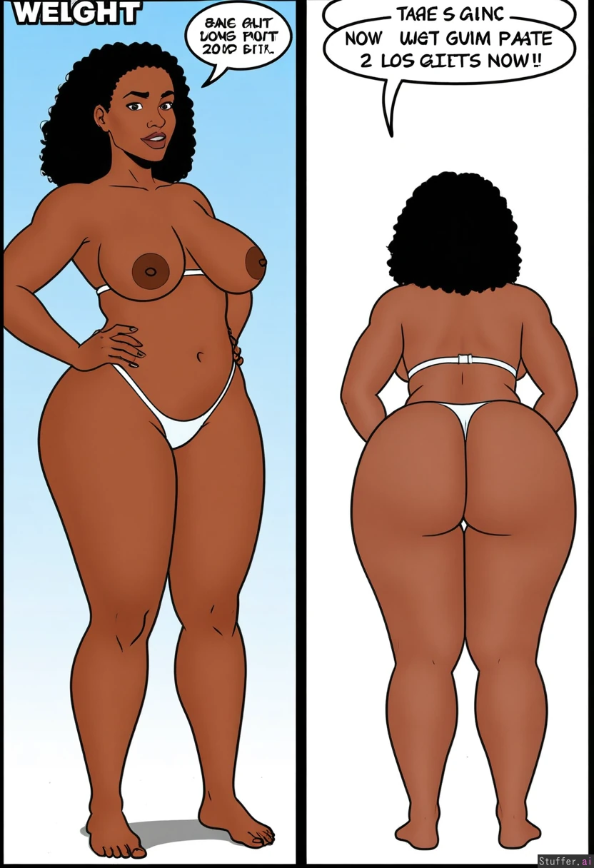 Weight gain comic page 1 skinny black girl Page 2 gains 50lbs Page 3 weighs 200lbs now with big butt