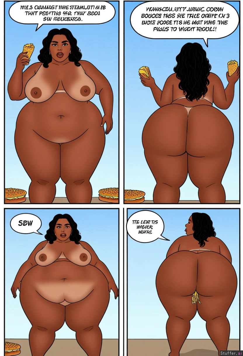 Weight gain comic page 1 skinny black girl Page 2 gains 50lbs Page 3 weighs 200lbs now with big butt Page 4 weighs 300lbs pear shaped huge butt Page 5 becomes a 500lbs Ssbbw stuffing her self with fast food and has rolls and a massive ass