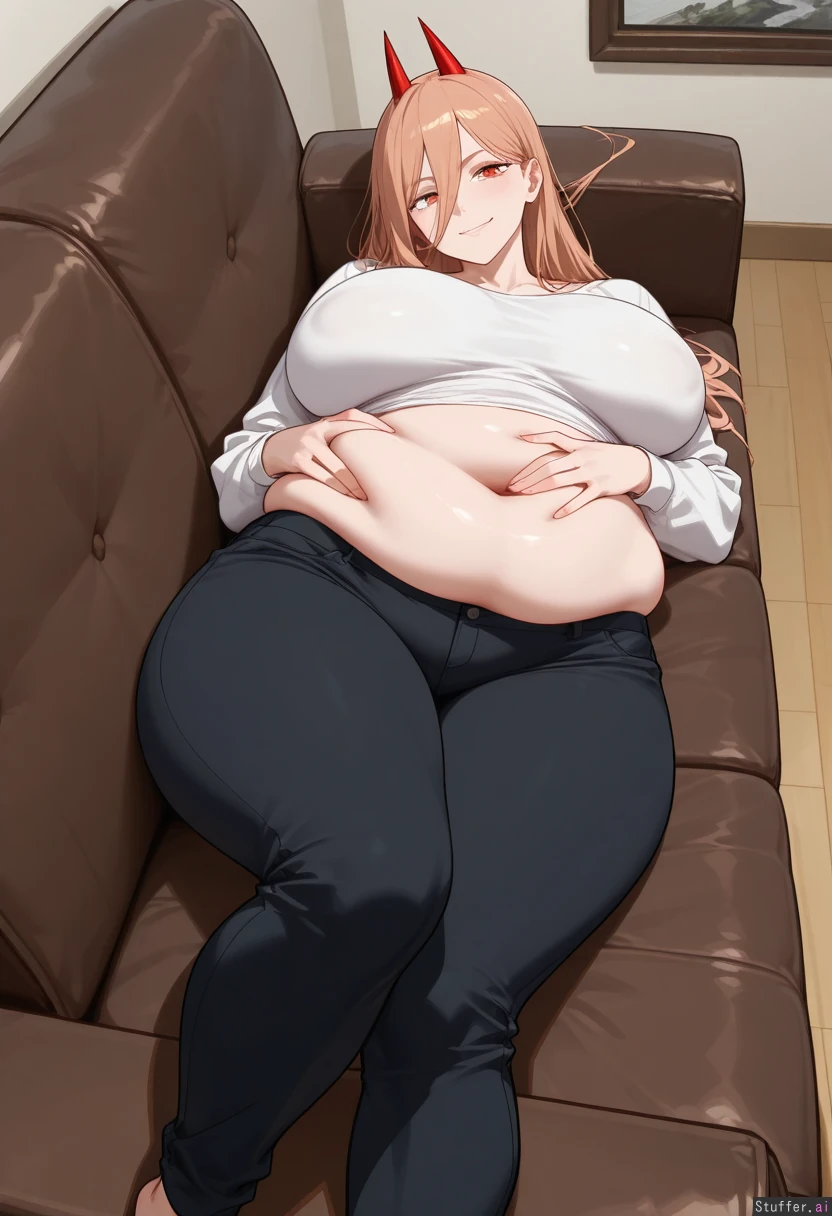 Gorgeous girl. ((Power Chainsaw man)) Pretty, detailed face. 8k detail. seductive smiling, confident horny, seductive eyes, solo female, tall legs, tall female, (brown couch) (lying on a couch), (((head is in the upper half of the picture))), (Touching belly), ((wears long black pants)), (black pants), (wears white shirt), (legs straight), (above view), (body in a straight line), (straight aligned couch), (fat ass:1.2), (thick thigs: 1.2) (wide hips: 1.2), (fat: 1.2), (very fat belly: 1.2), (huge round breasts: 1.2), (bbw: 1.2),