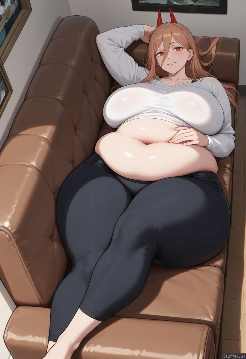 Gorgeous girl. ((Power Chainsaw man)) Pretty, detailed face. 8k detail. seductive smiling, confident horny, seductive eyes, solo female, tall legs, tall female, (brown couch) (lying on a couch), (((head is in the upper half of the picture))), (Touching belly), ((wears long black pants)), (black pants), (wears white shirt), (legs straight), (above view), (body in a straight line), (straight aligned couch), (looking at her belly), (horny face), (fat ass:1.2), (thick thigs: 1.2) (wide hips: 1.2), (fat: 1.2), (very fat belly: 1.2), (huge round breasts: 1.2), (bbw: 1.2), (massive hips: 0.9), (ssbbw: 0.9), (massive gigantic ass: 0.9), (morbidly obese: 0.9)