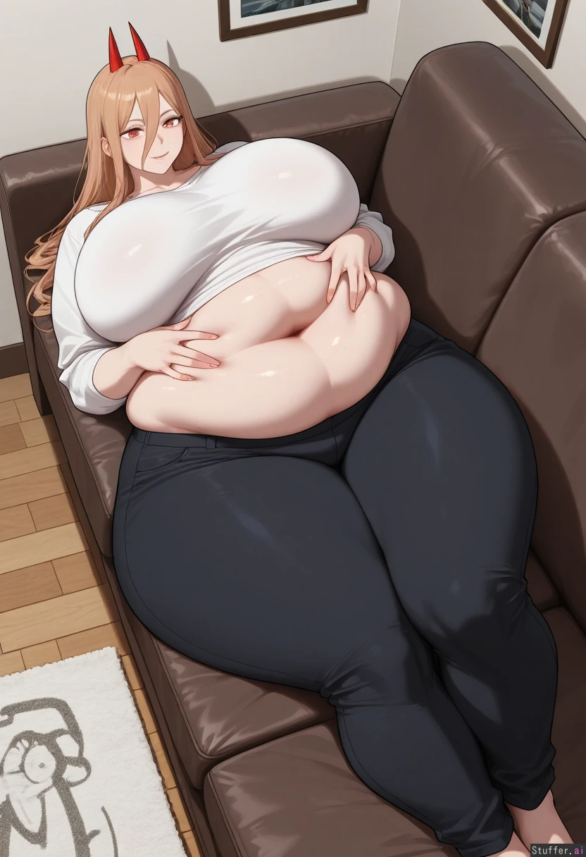 Gorgeous girl. ((Power Chainsaw man)) Pretty, detailed face. 8k detail. confident horny, seductive eyes, solo female, tall legs, tall female, (brown couch) (lying on a couch), (((head is in the upper half of the picture))), (Touching belly), ((wears long black pants)), (black pants), (wears white shirt), (legs straight), (above view), (body in a straight line), (straight aligned couch), (looking at her belly), (horny face), (fat ass:1.2), (thick thigs: 1.2) (wide hips: 1.2), (fat: 1.2), (very fat belly: 1.2), (huge round breasts: 1.2), (bbw: 1.2), (massive hips: 1,3), (ssbbw: 1,3), (massive gigantic ass: 1,3), (morbidly obese: 1,3)