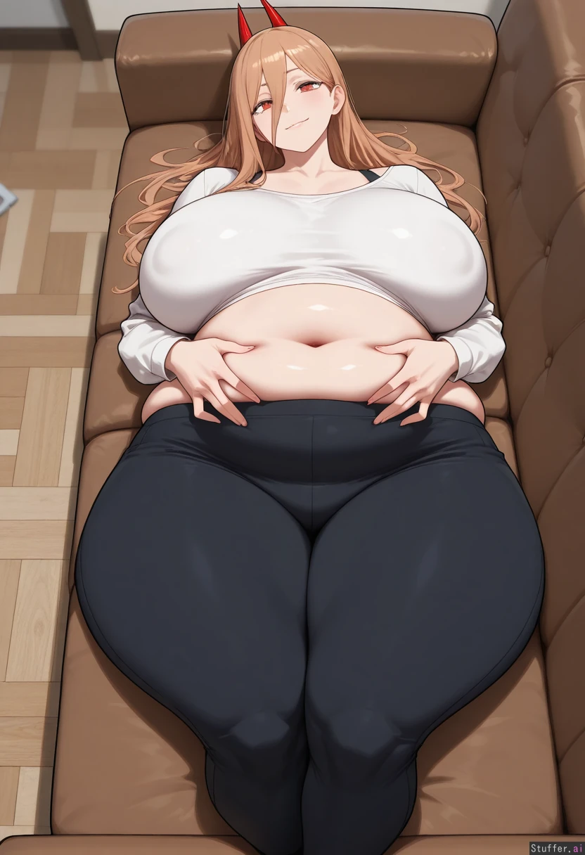 Gorgeous girl. ((Power Chainsaw man)) Pretty, detailed face. 8k detail. confident horny, seductive eyes, solo female, tall legs, tall female, (brown couch) (lying on a couch), (((head is in the upper half of the picture))), (Touching belly), ((wears long black pants)), (black pants), (wears white shirt), (legs straight), (above view), (body in a straight line), (straight aligned couch), (looking at her belly), (horny face), (fat ass:1.2), (thick thigs: 1.2) (wide hips: 1.2), (fat: 1.2), (very fat belly: 1.2), (huge round breasts: 1.2), (bbw: 1.2), (massive hips: 1,3), (ssbbw: 1,3), (massive gigantic ass: 1,3), (morbidly obese: 1,3)