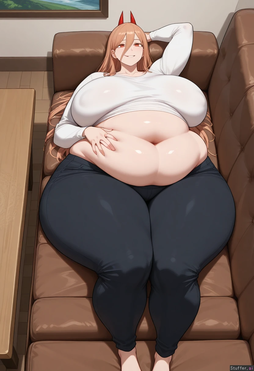 Gorgeous girl. ((Power Chainsaw man)) Pretty, detailed face. 8k detail. confident horny, seductive eyes, solo female, tall legs, tall female, (brown couch) (lying on a couch), (((head is in the upper half of the picture))), (Touching belly), ((wears long black pants)), (black pants), (wears white shirt), (legs straight), (above view), (body in a straight line), (straight aligned couch), (looking at her belly), (horny face), (fat ass:1.2), (thick thigs: 1.2) (wide hips: 1.2), (fat: 1.2), (very fat belly: 1.2), (huge round breasts: 1.0), (bbw: 1.2), (massive hips: 1,3), (ssbbw: 1,9), (massive gigantic ass: 1,3), (morbidly obese: 1,9), (gigantic belly: 1,9), (double belly: 1,9), (love handles: 1,7), (abnormal proportions: 1,3), (massive belly overhang: 1,5)