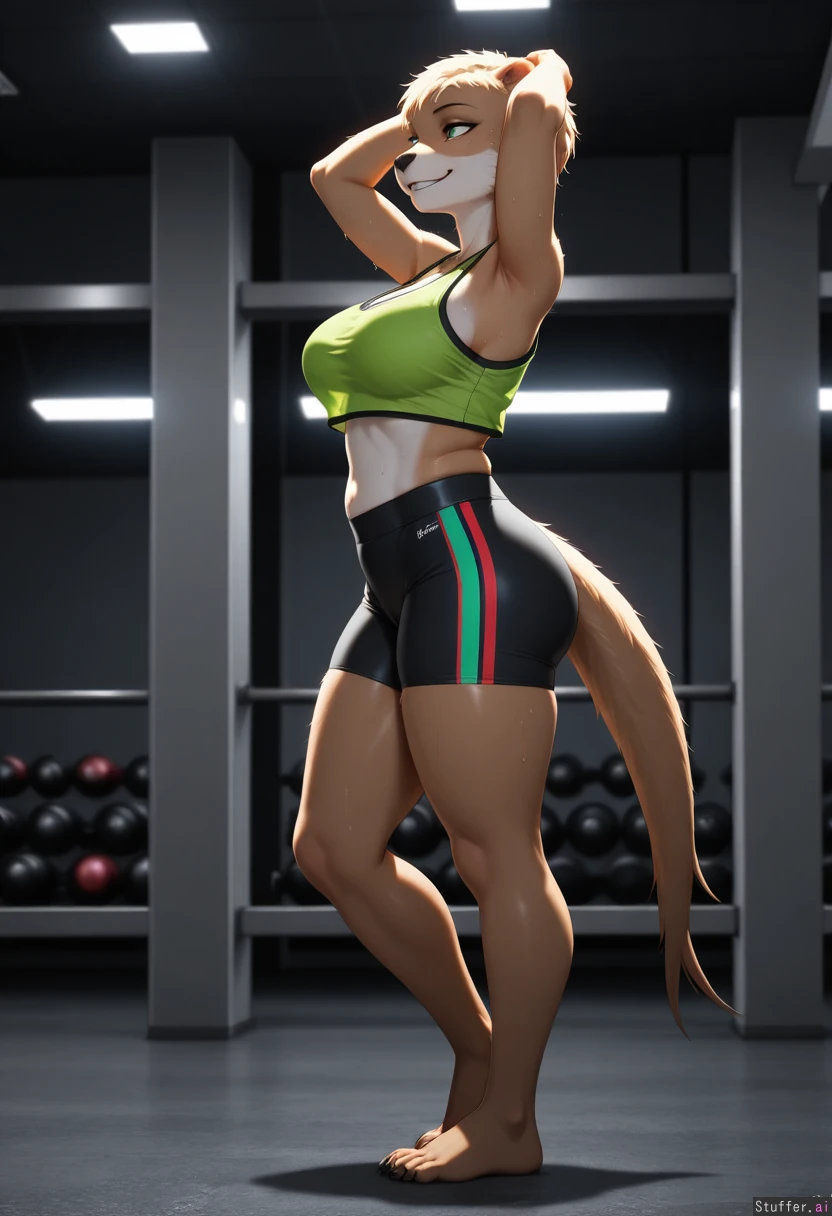 Hyper ultra quality Ultra UHD 8k, hyper realism, masterpiece, perfect, Furry, anthro female sea otter, mature, bright green crop top, black yoga shorts, green eyes, (no haircut:1.5), fluffy head, (best quality), (hdr), (detailed background), (motion lines), (expressive), (high rating), (highly detailed), intricate detail, (definition lines), detailed face, (highly detailed eyes), (glossy realistic skin), (good lighting:1.2), (detailed face:1.2), (clarity), fluff on head, view from side, view from front, smiling, sweating, exhausted, full body view, Standing, Gym with workout equipment background, hands above head, (), (Plump:1), thick_thighs,