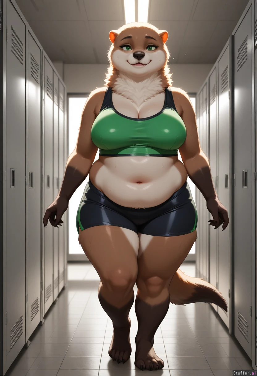 Hyper ultra quality Ultra UHD 8k, hyper realism, masterpiece, perfect, Furry, anthro female sea otter, mature, bright green crop top, black yoga shorts, green eyes, (no haircut:1.2), fluffy head, (best quality), (hdr), (detailed background), (motion lines), (expressive), (high rating), (highly detailed), intricate detail, (definition lines), detailed face, (highly detailed eyes), (glossy realistic skin), (good lighting:1.2), (detailed face:1.2), (clarity), fluff on head, view from front side, smiling, sweating, exhausted, full body view, Walking, Locker room background, (), (Chubby:1.3), thick_thighs,