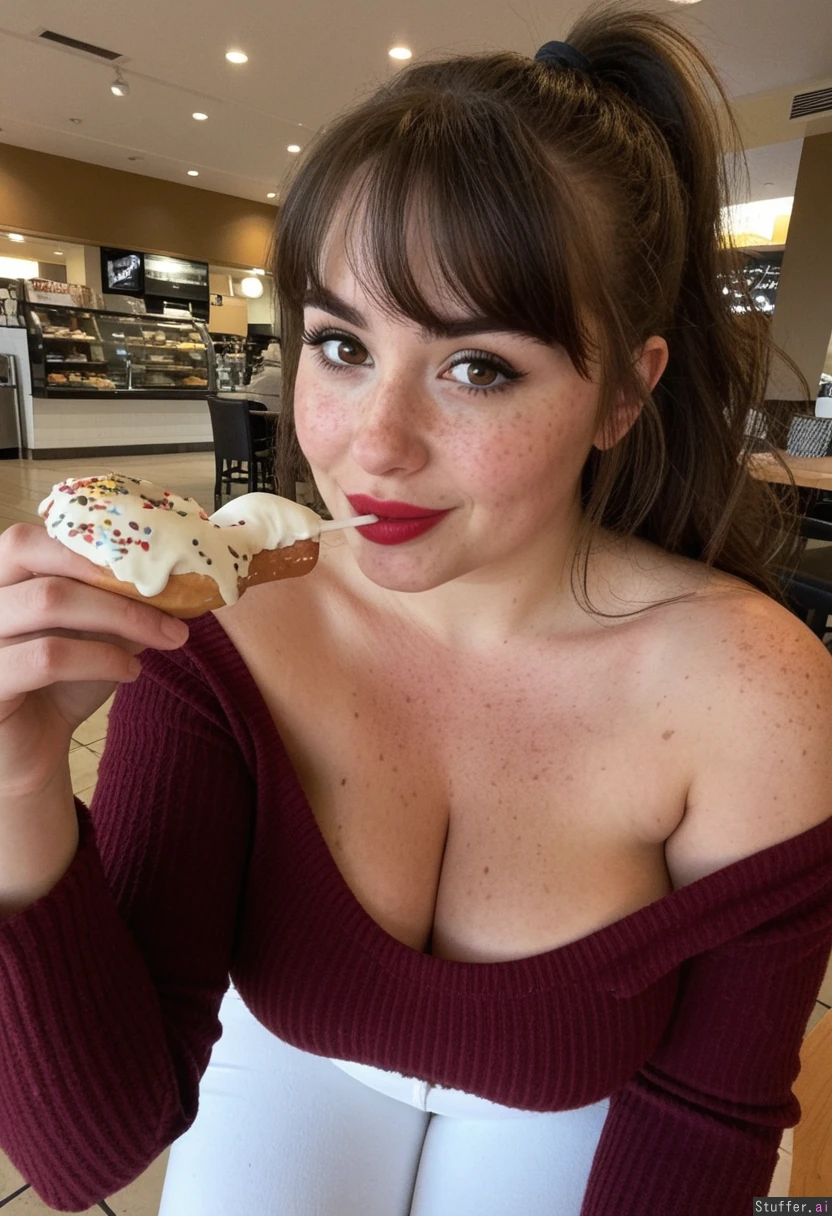 (selfie) 25 year old woman (Brunette, perfect beautiful hair, messy long ponytail, messy bangs) (brown eyes, red lipstick, freckles, full lips, soft cheeks, narrrow nose, laughlines) off shoulder maroon sweater, white jeans (tight clothes) (huge cleavage, curvy) sitting in cafe eating donuts
