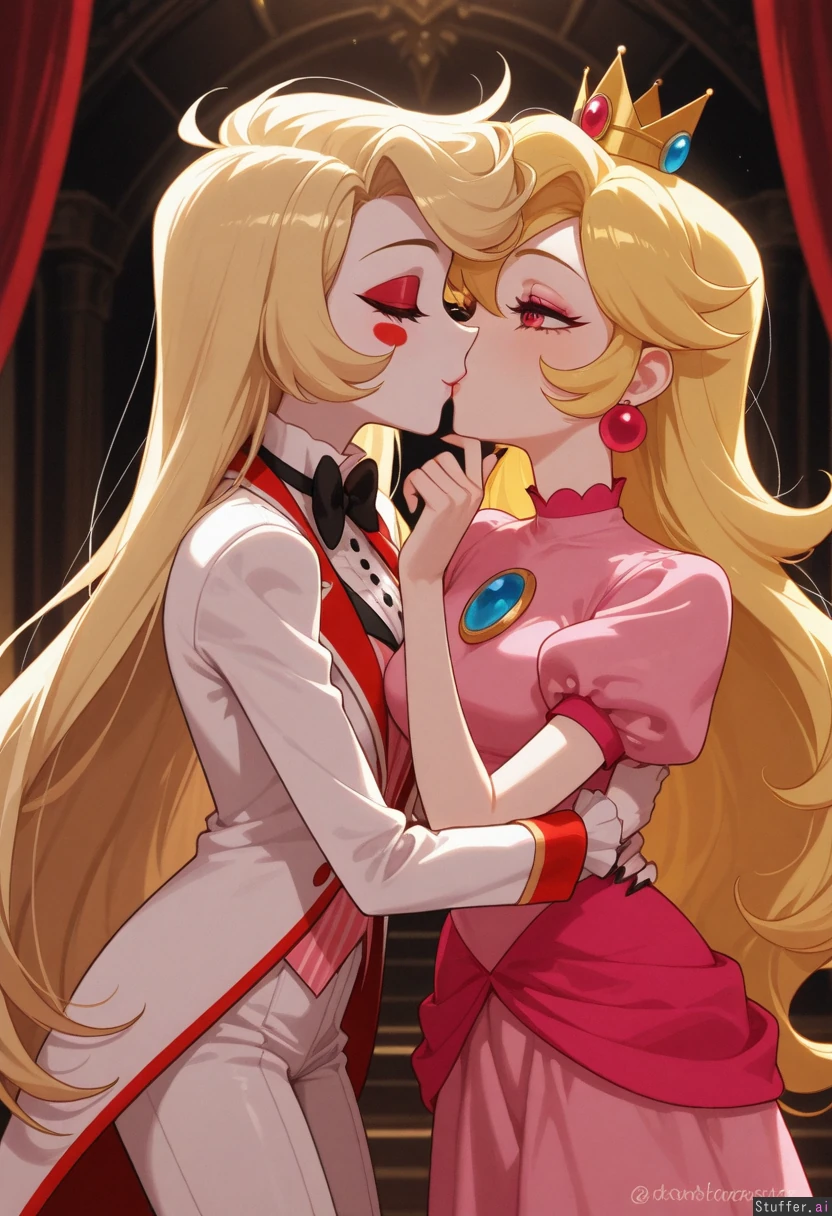 ((two_characters)), ((((Charlie_Morningstar, long_blonde_haired_female, (pale_white_skin), (wearing_red_tuxedo), ((Hazbin_Hotel))), detailed_background_Hazbin_Hotel, ((kissing)), ((princess_Peach, blonde_female, wearing_pink_dress_and_golden_crown, ((Caucasian)))), one_panel