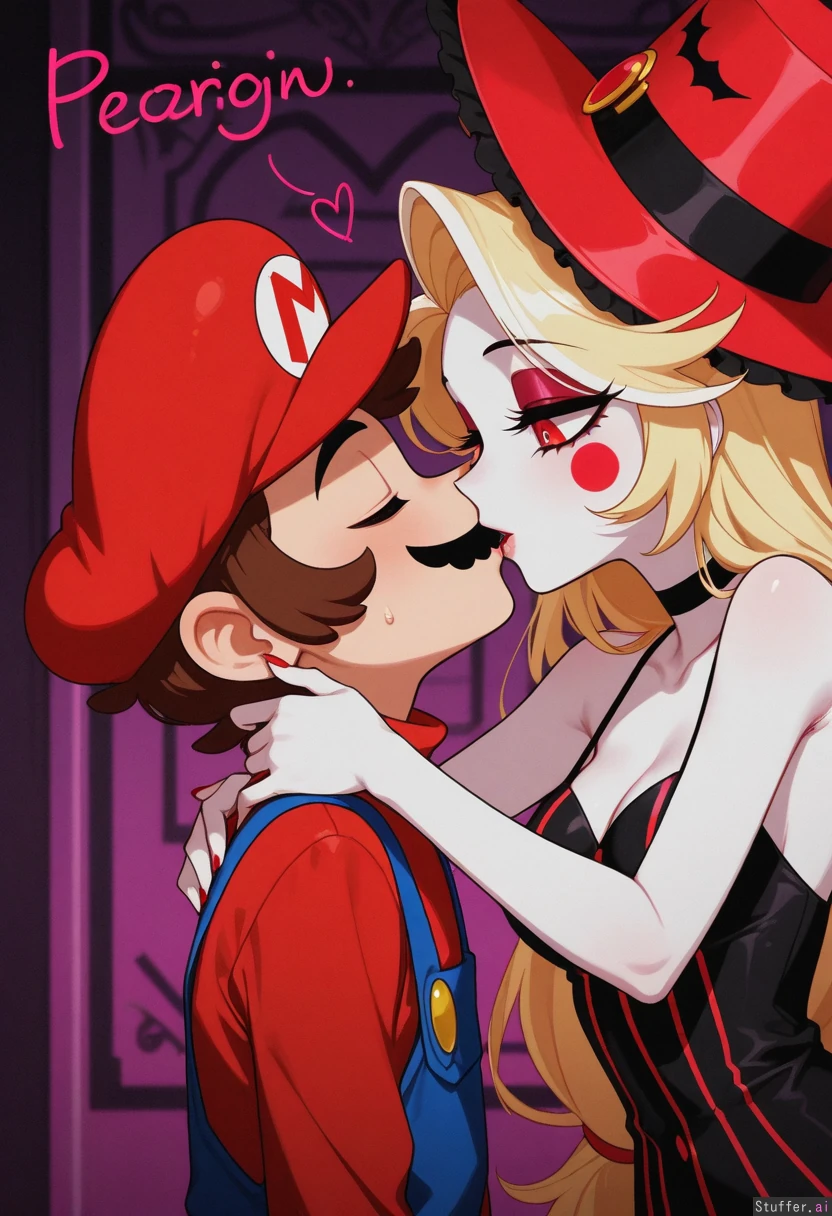 ((two_characters)), ((((Charlie_Morningstar, (long_blonde_haired_((female)), (pale_white_skin), (wearing_plain_red_tuxedo), ((Hazbin_Hotel))), detailed_background_Hazbin_Hotel, ((kissing)), ((Mario, (Mario), male, wearing_red_hat_red_shirt_and_blue_overalls, brown_hair, black_mustache, ((Caucasian)))), one_panel