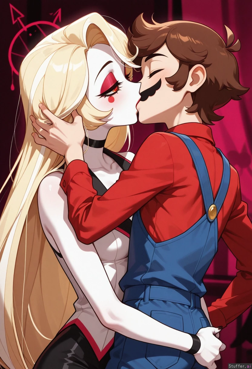 ((two_characters)), ((((Charlie_Morningstar, (long_blonde_haired_((female)), (pale_white_skin), (wearing_plain_red_tuxedo), Hazbin_Hotel)), ((kissing)), ((Mario, (Mario), human_male, wearing_red_shirt_and_blue_overalls, ((brown_hair, black_mustache)), ((Caucasian)))), one_panel