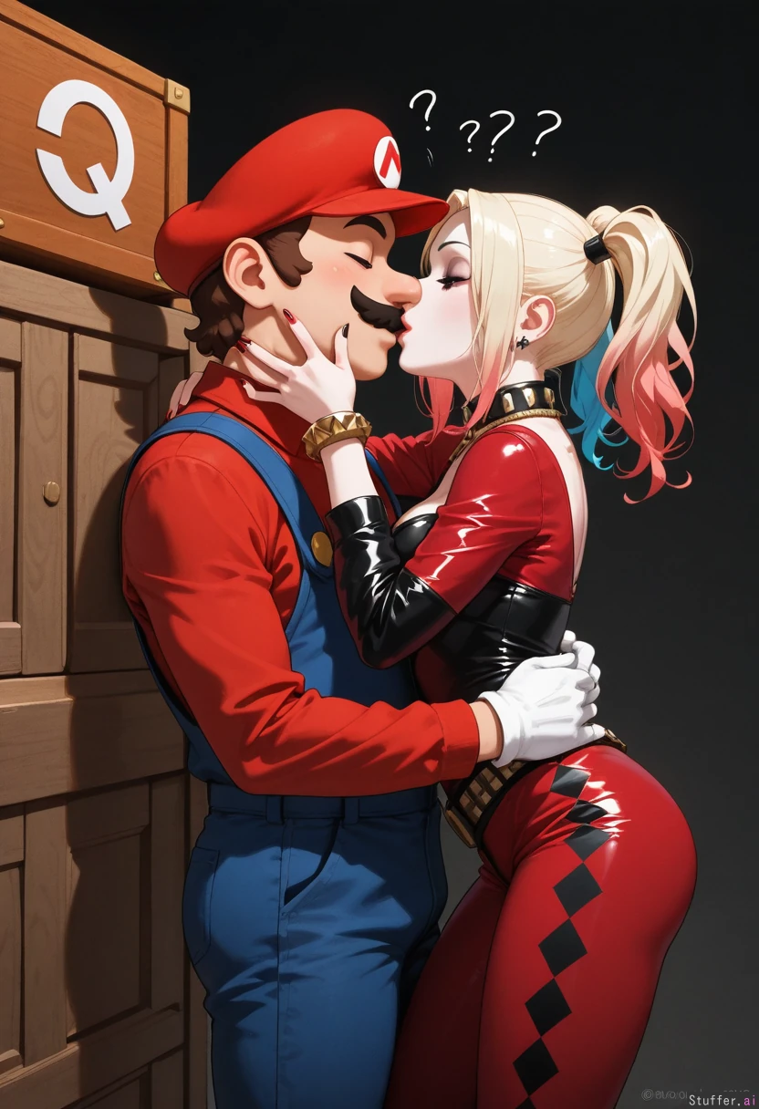 ((mario, short_male, brown_hair, black_moustache)), ((standing_on_question_block)), kissing, harley_quinn, best_quality, good_anatomy,