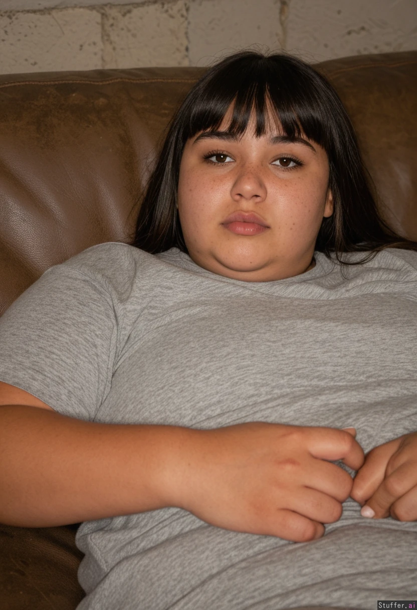 Gorgeous indigenous woman, dark skin, round face, (very fat cheeks), wispy bangs, 25 years old, freckles, full lips, gorgeous face, Laying on a brown couch, Old Basement background, lazy, Grey sweat pants, grey top, Chubby, Seducive expression, (Seducive pose)