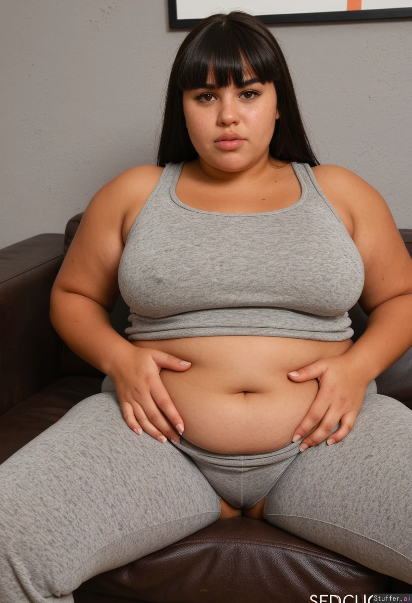 Gorgeous indigenous woman, dark skin, round face, (very fat cheeks), wispy bangs, 25 years old, freckles, full lips, gorgeous face, Sitting on a brown couch, legs together, hands on hips, Old Basement background, lazy, Grey sweat pants, grey top, Chubby, wide hips, thick thighs, (Visibly horny, seducive expression, Seducive pose)