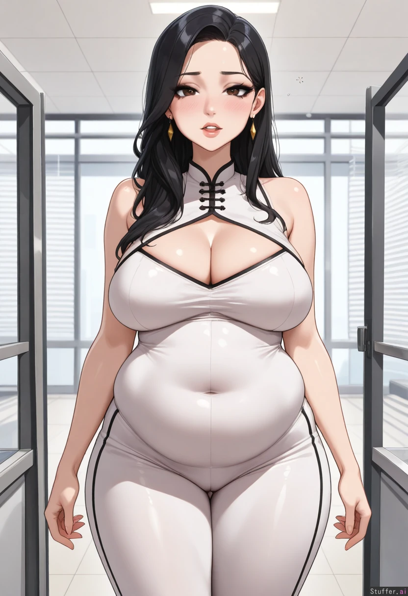absurdres, 8k, perfect anatomy, masterpiece, beautiful face, beautiful eyes, RockSolidArt. /(artist/), RockSolidArt(artist/) ,8), (merunyaa), (usa37107692:1.2), (ohasi_art), (betterwithsalt), (flat color:1.5) (((solo, 1woman))), mature, milf, ((adult woman:1.4)), (((super ill-fitting office-outfit:1.4, secretary-lingiere))), ((Volumptuous Hair down, black hair, (chinese-hair:1.4), asian skin-tone, (heavy eyeliner, dark eyeshadow, dark eyeliner, looking at viewer), long hair, sideswept hair, chinese ethnicity:1.4, china-ethnicity, ethnic-chinese features:1.4, chinese-features:1.4)), super-full belly:1.2, (massive belly longer than body:1.6), hyper-huge belly:1.6, ((super-soft belly:1.4), cleavage:1.4, constricted belly, belly overflow:1.2)), ((Obese, overweight:1.4)), ((thick thighs)), ((worried)), (hyper belly:1.4, belly_inflation), ((big belly:1.4)), (hands down at sides), breasts squished together by top:1.4, (Office background, bright window, cubicles in background), (self-deprecating, submissive, flirty, timid, uncertain, nervous), ((plump_thighs, Impressive oversized thighs, plumped-fat cameltoe, Huge rear)), round plump buttocks:1.4, sagging phat-ass:1.4, (Medium plump breasts:1.4), sagging breasts, droopy breasts, (realistic breasts:1.4, natural breasts:1.4, plump-soft breasts:1.4, full_to_the_limit breasts:1.2), ((Huge full-inflated belly:1.6)), (Huge belly:1.4), (Huge potbelly:1.4), (huge bellyinflation:1.4, super belly_blush:1.4), ((hyper-belly sticking out unrealistically-further than body:1.6, super-long massive-belly distended unrealistically-longer than body:1.6, low-hanging belly:1.6)), (big pleading eyes, submissive, ((bleary-eyed:1.4, flushed face:1.4, drunk bubbles:1.4), head-tilted:1.2, motion lines)), ((desperately horny:1.4, pleading expression:1.4, ((orgasm_denial)), slight-ahegao, open mouth heavy breathing, heavy panting)), hdr, c.cu:1.2, blushyspicy:1.4, prywinko:1.4, betterwithsalt:1.2, icarusillustrations:1.4, Icarusillustrations:1.2, kittew:1.2, (spellsX\(artist\):1.3), (Coffeeslice\(artist\):1.3), (ohshinakai\(artist\):1.2), (doveymouse\(artist\):1.3), (((Super-lewd body:1.4))), (super detailed:1.2, excellent shading:1.3, vibrant coloring:1.3, watercolor:1.3, dynamic lighting:1.4), **base** (best quality), (high rating), absurd res, high res, detailed, ultra quality, ((high quality)), masterpiece, (ultra high resolution), stunning beauty, detailed face, intricate detail, sophisticated detail, exquisite detail, perfect 2D art, realistic lighting, cel shading, correct anatomy, 8k, highly detailed skin texture, 1girl, ((hyperrealistic, photorealistic, fully rendered, realistic style)), **CWG:** ((pencil sketch style), (rough lines and lineart), (realistic sketch), (detailed sketch), (technical sketch), (detailed sketch style), (excellent dynamic shading), (full color), (intricate detailed textures)), c.cu(artist), kittew(artist), prywinko(artist), spellsx(artist), ohshinakai(artist), doveymouse(artist), Ninjart1st(artist), c.cu(artist), kittew(artist), prywinko(artist), spellsx(artist), ohshinakai(artist), doveymouse(artist), Ninjart1st(artist), c.cu\(artist\):1.3), (blushyspicy\(artist\):1.2), (kipteitei\(artist\):1.2), (spellsX\(artist\):1.3), (Kittew\(artist\):1.3), (ohshinakai\(artist\):1.2), (doveymouse\(artist\):1.3), (Ninjart1st\(artist\):1.2), (Jellybelly\(artist\):1.3), (troat301186\(artist\):1.2), (toraraz\(artist\):1.3), ((highest resolution and clarity)), (perfect human anatomy), (high image clarity, sharp image focus), (4k_UHD, highly detailed, highest rating, high resolution, masterpiece quality, realistic expressions, intricate texture detail, dynamic lighting), detailed face, best quality, masterpiece, (plump:1.5), (thick), (fat:1.2), massive belly, hdr, c.cu:1.2, blushyspicy:1.4, prywinko:1.4, betterwithsalt:1.2, icarusillustrations:1.4, Icarusillustrations:1.2, kittew:1.2, (spellsX\(artist\):1.3), (Coffeeslice\(artist\):1.3), (ohshinakai\(artist\):1.2), (doveymouse\(artist\):1.3), (((Super-lewd body:1.4))), (flat colors). ((white cutline-outline):1.3). masterful comic-book shading. masterpiece drawing. well-drawn lines. simple detailed eyes. pupils. gorgeous hair. beautiful woman. full lips. goblinhordestudios. kipteitei. pewbutt. betterwithsalt