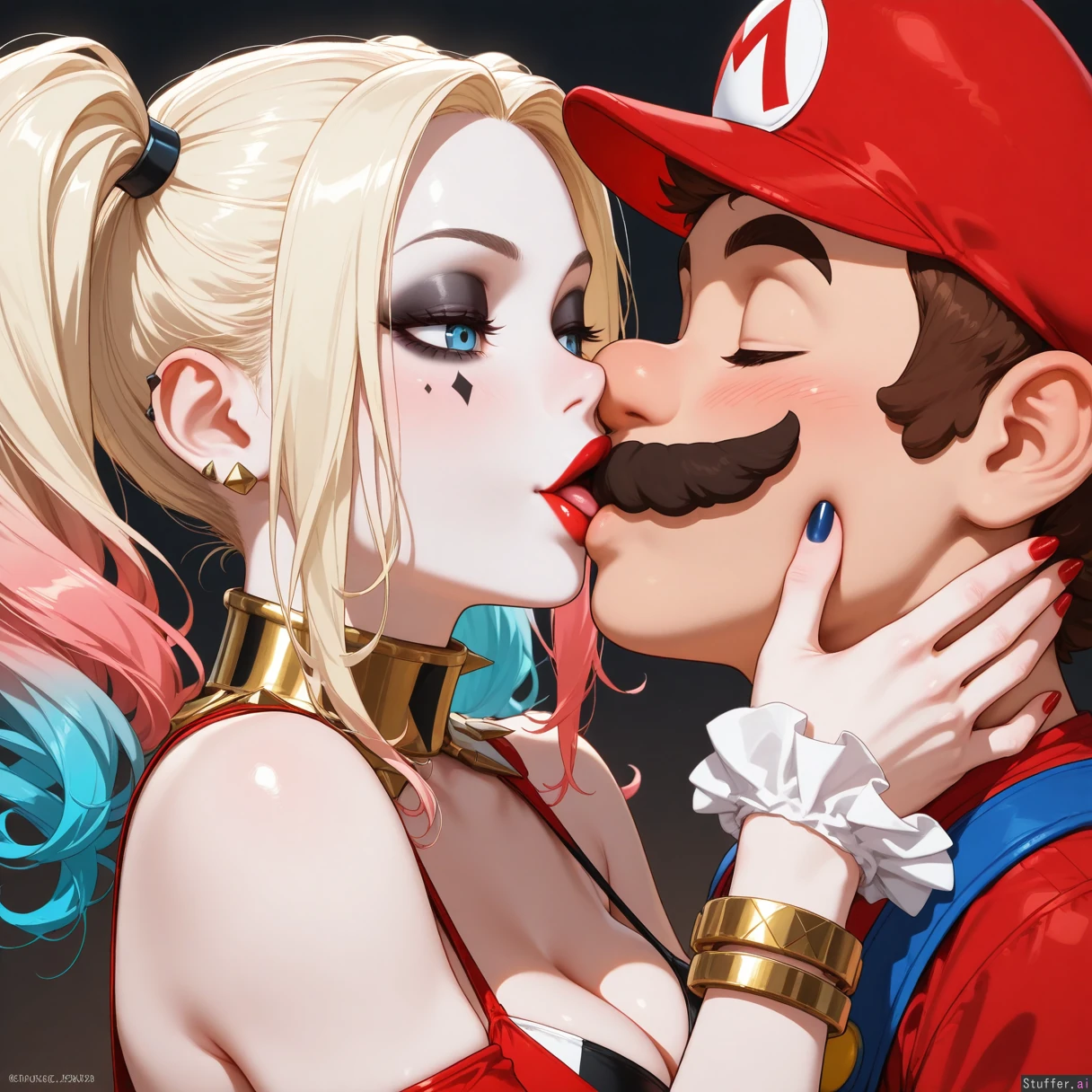 ((mario, male, wearing_red_hat, brown_hair, black_moustache)), kissing, ((harley_quinn, female, large_breats)), best_quality, good_anatomy, ((one_panel))