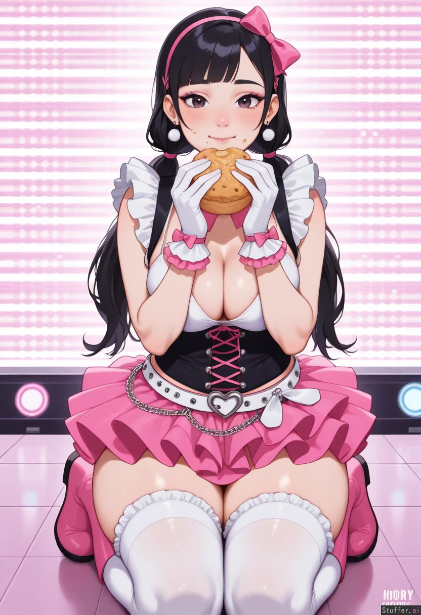Highly detailed, KAMII MOMORU(artist), performance stage, colored lights, detailed face, anime, kneeling Japanese girl, 18yo, (earings, pink big Bow-tie in hair, earrings, very Cute, (J-pop idol:1.3), (Horny:1.3), hair bangs, (side bangs:1.1), deep cleavage, short pink skirt, blush, white very high socks, long hair, black hair, skinny, white bikini top, pink bow-tie collar, low-pigtails, white frilled gloves, black small corset, white heart belt, chains on belt, short Frilled straps, pink high boots:1.1) Thick thighs, chubby, eating muffins, muffins crumbs on face