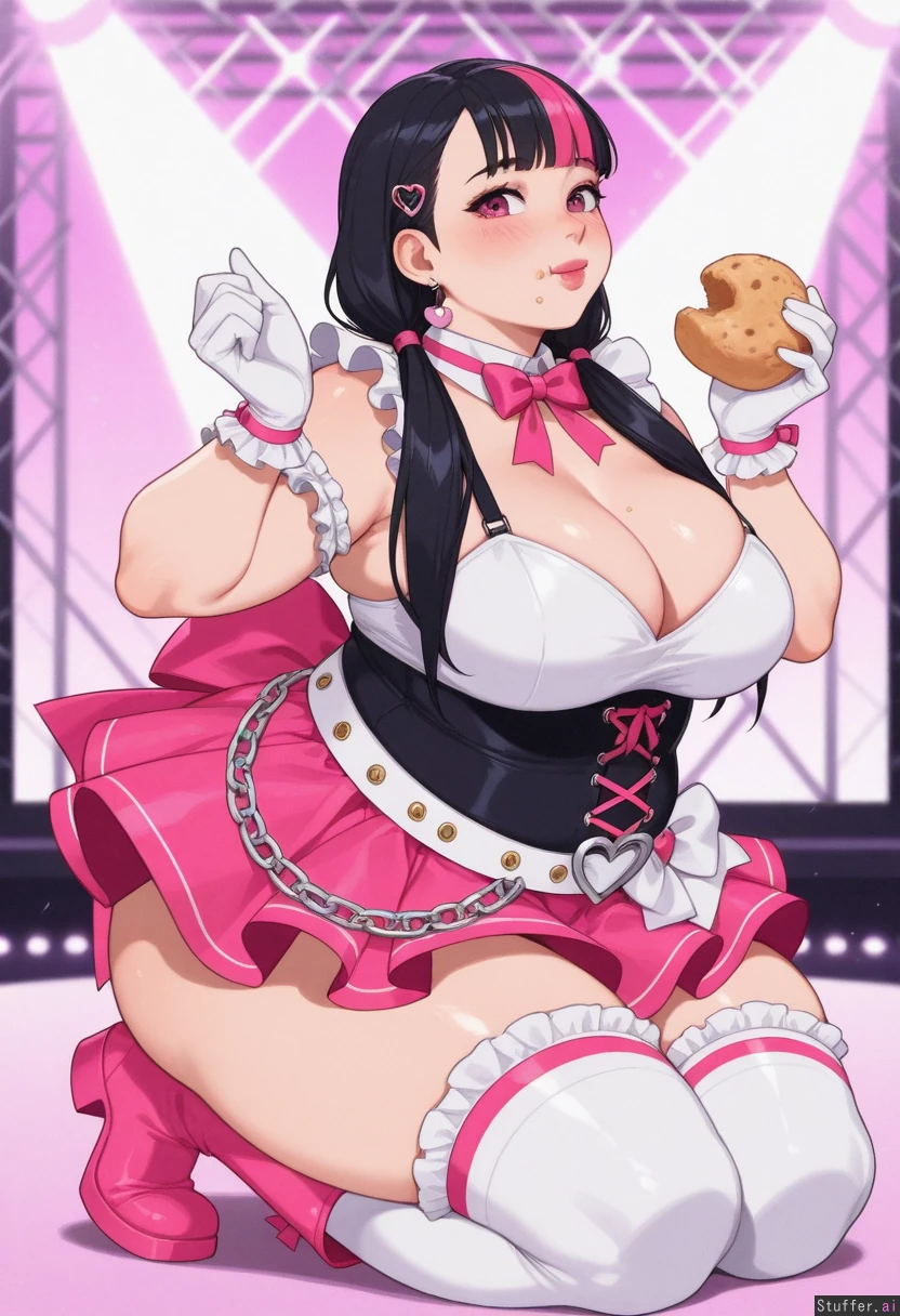 Highly detailed, KAMII MOMORU(artist), performance stage, colored lights, detailed face, anime, kneeling Japanese girl, 18yo, (earings, pink big Bow-tie in hair, earrings, very Cute, (J-pop idol:1.3), (Horny:1.3), hair bangs, (side bangs:1.1), deep cleavage, short pink skirt, blush, white very high socks, long hair, black hair, skinny, white bikini top, pink bow-tie collar, low-pigtails, white frilled gloves, black small corset, white heart belt, chains on belt, short Frilled straps, pink high boots:1.1) Thick thighs, morbidly obese, eating muffins, muffins crumbs on face