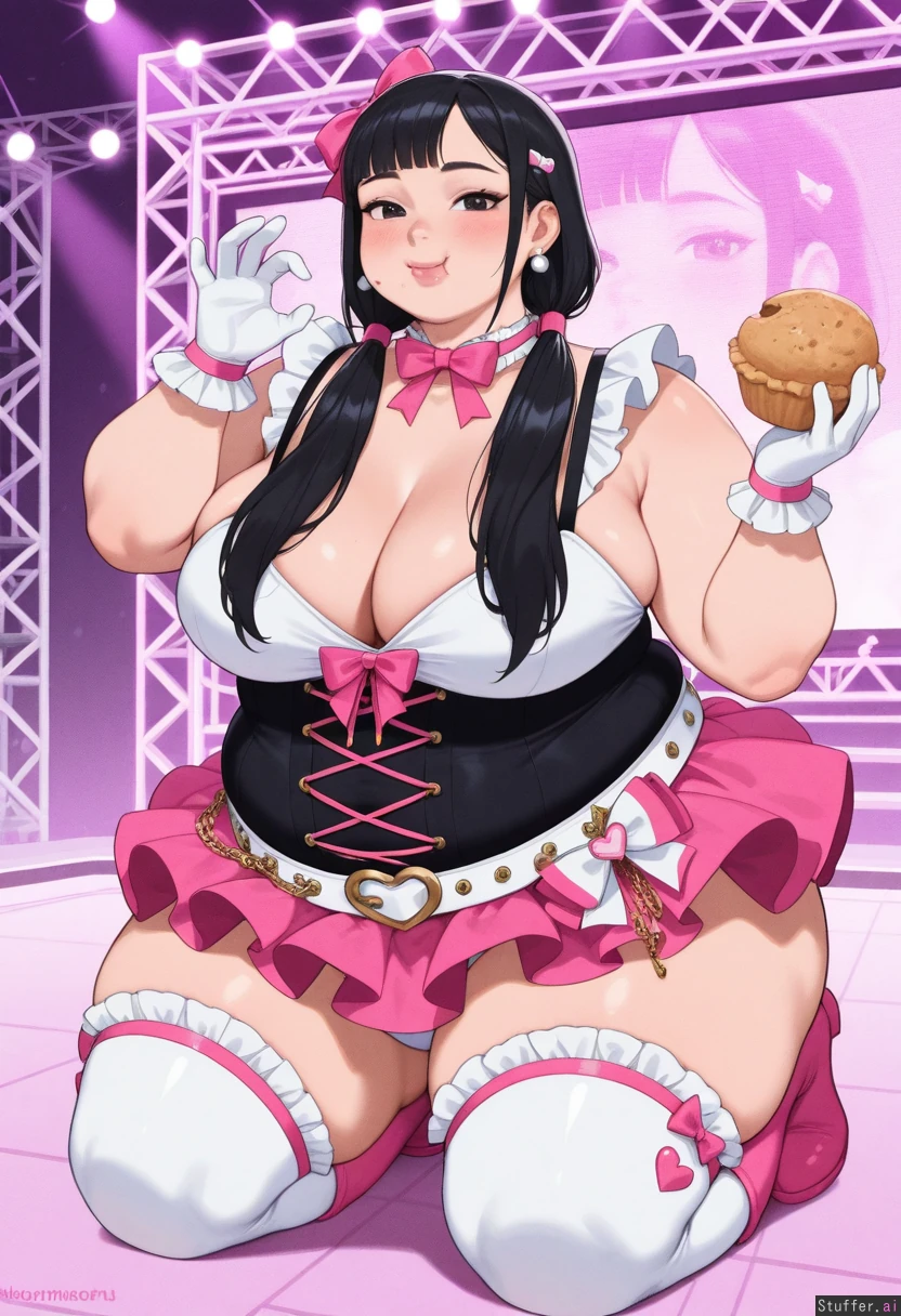Highly detailed, KAMII MOMORU(artist), performance stage, colored lights, detailed face, anime, kneeling Japanese girl, 18yo, (earings, pink big Bow-tie in hair, earrings, very Cute, (J-pop idol:1.3), (Horny:1.3), hair bangs, (side bangs:1.1), deep cleavage, short pink skirt, blush, white very high socks, long hair, black hair, skinny, white bikini top, pink bow-tie collar, low-pigtails, white frilled gloves, black small corset, white heart belt, chains on belt, short Frilled straps, pink high boots:1.1) Thick thighs, (morbidly obese:1.2), eating muffins, muffins crumbs on face