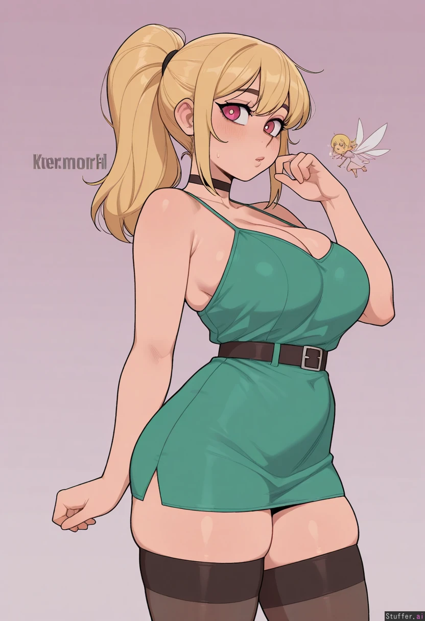masterpiece, best quality, score_7. High_rating, best_quality, HDR, highly_detailed, exquisite_detail, amazing_resolution, perfect_anatomy, beautiful_shading, ((clarity)), Krekkov(artist), KAMII MOMORU(artist), vanripper(artist), ((Skindentation)), Standing, Fairy, blonde hair, pink_eyes , ponytail, soft Pink dress