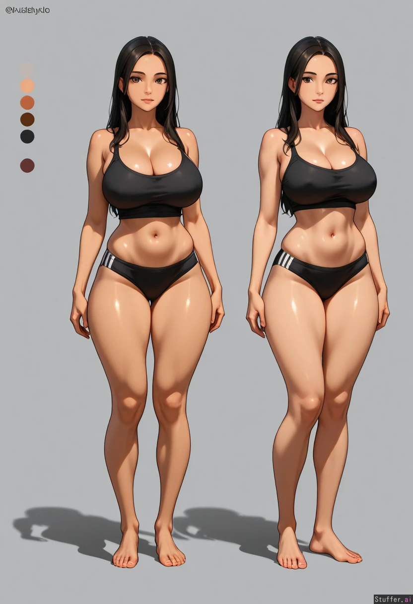 Turkish female, black long Hair, brown big eyes, large boobs, black Spaghetti top, athletic body, skinny, thick thighs, cleavage, standing, tall_female, full_body, skinny