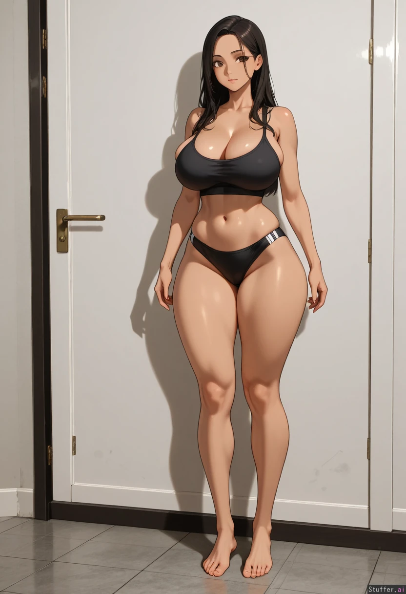 Turkish female, black long Hair, brown big eyes, large boobs, black Spaghetti top, athletic body, skinny, thick thighs, cleavage, standing, tall_female, full_body, skinny, boobd overflowing