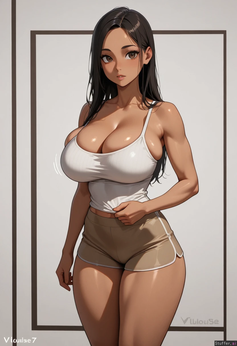 Turkish female, black long Hair, brown big eyes, large boobs, white vlouse,clothes bursting, athletic body, skinny, thick thighs, cleavage, standing, tall_female, full_body, skinny, boobd overflowing, button popping off