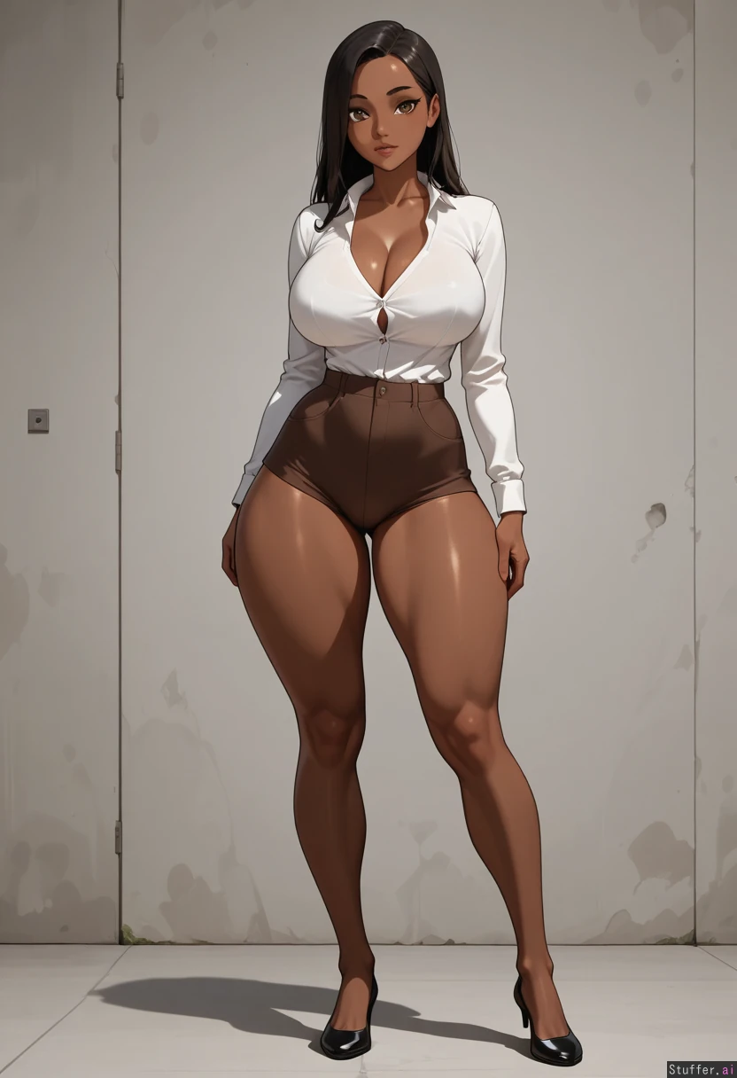 Turkish female, black long Hair, brown big eyes, large boobs, white vlouse,clothes bursting, athletic body, skinny, thick thighs, cleavage, standing, tall_female, full_body, skinny, boobd overflowing, button popping off