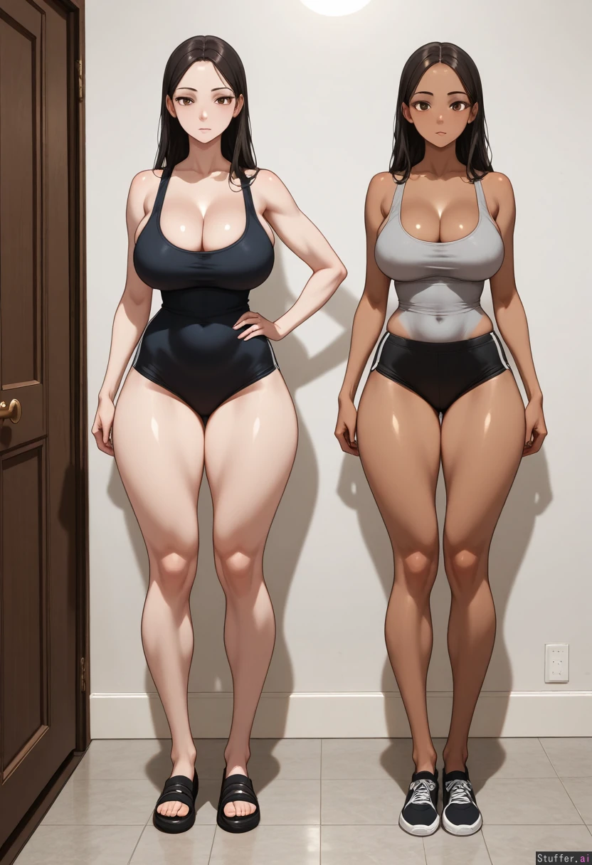 2 girls, Turkish female, black long Hair, brown big eyes, large boobs, white vlouse,clothes bursting, athletic body, super skinny, thick thighs, cleavage, standing next to skinny female, tall_female, full_body, skinny, boobd overflowing, button popping off
