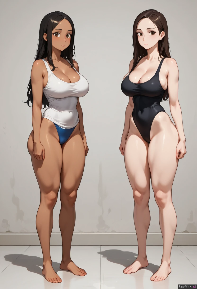 2 girls, Turkish female, black long Hair, brown big eyes, large boobs, white vlouse,clothes bursting, athletic body, super skinny, thick thighs, cleavage, standing next to skinny shorter female, tall_female, full_body, skinny, boobd overflowing, button popping off