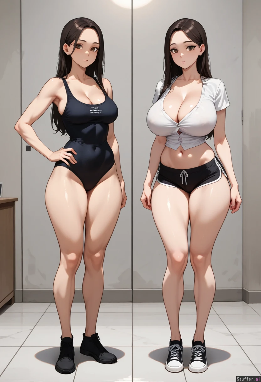 2 girls, Turkish female, black long Hair, brown big eyes, large boobs, white vlouse,clothes bursting, athletic body, super skinny, thick thighs, cleavage, standing next to skinny female, tall_female, full_body, skinny, boobd overflowing, button popping off, comparing boobs